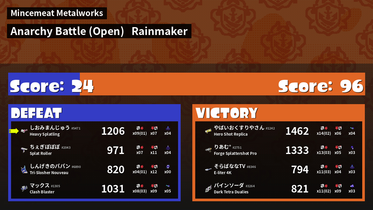| Medals | #1 Overall Splatter #1 Turf Inker #1 Enemy Splatter | ||