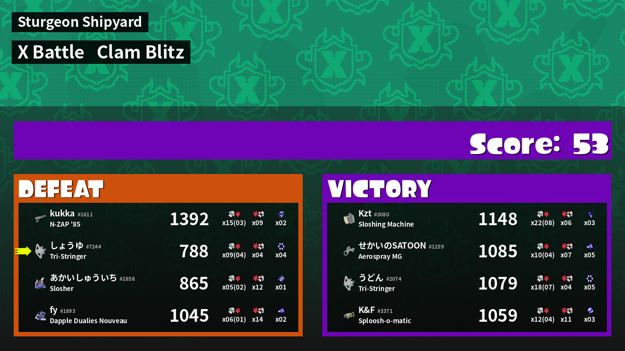 | Medals | #1 Super Jump Spot #1 Splat Assister #1 Clam Stopper | ||