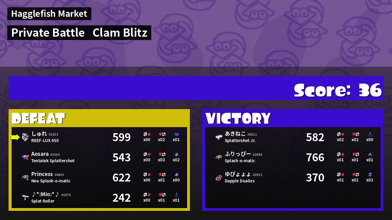 | Medals | #1 Clam Carrier #1 Damage Taker #1 Tenta Missiles User | ||