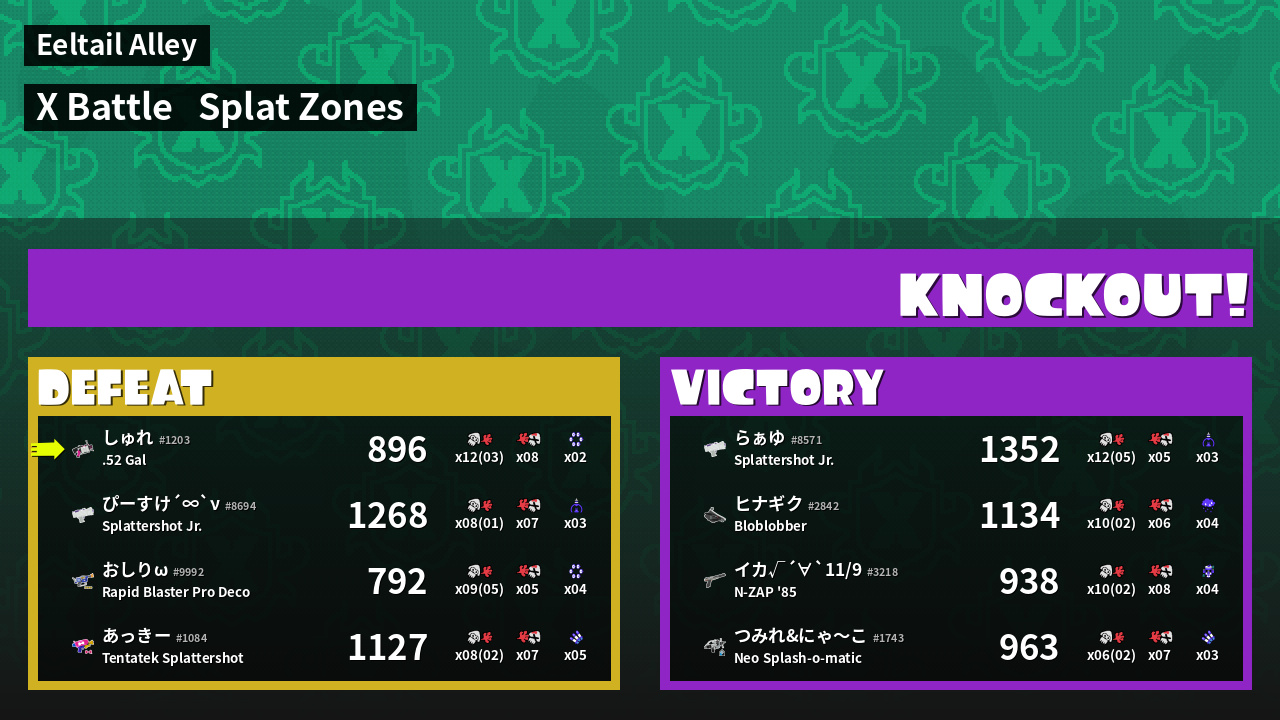 | Medals | #1 Overall Splatter #1 Splat Zone Guard #1 Enemy Splatter | ||