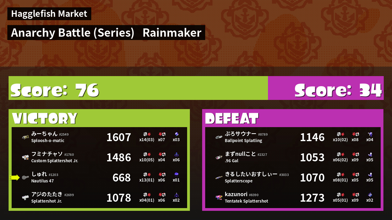 | Medals | #1 Enemy Splatter #1 Rainmaker Stopper #2 Overall Splatter | ||