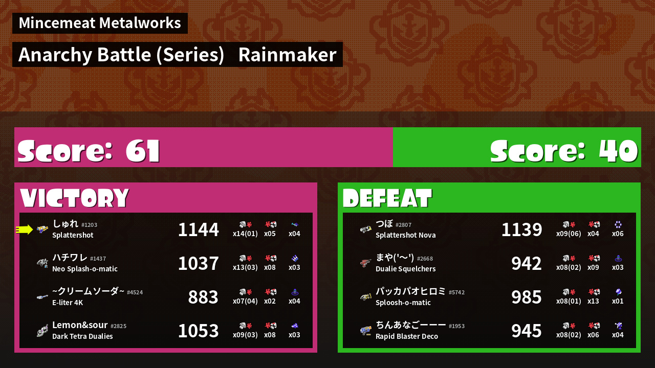 | Medals | #1 Overall Splatter #1 Turf Inker #1 Enemy Splatter | ||