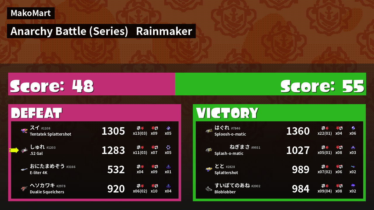 | Medals | #1 Splat Assister #1 Rainmaker Carrier #1 Rainmaker Stopper | ||