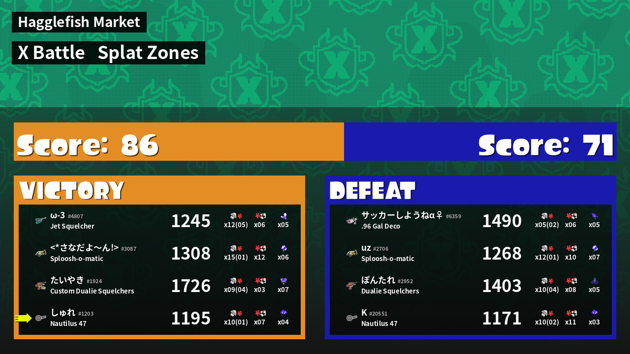 | Medals | #1 Super Jump Spot #1 Damage Taker #2 Splat Zone Inker | ||