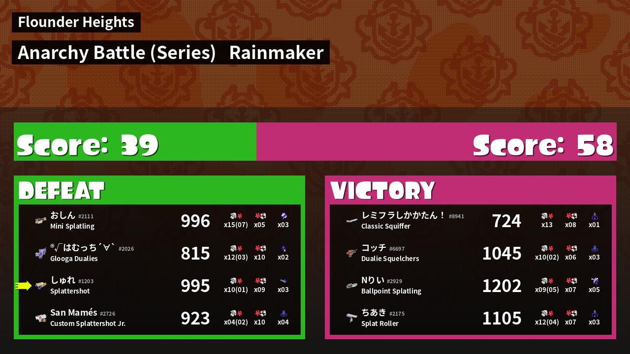 | Medals | #1 Enemy Splatter #1 Damage Taker #2 Turf Inker | ||