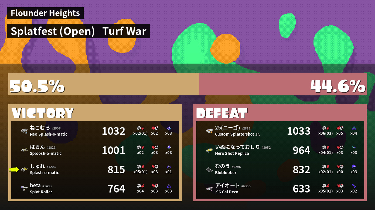 | Medals | #1 Overall Splatter #1 Home-Base Inker #1 Enemy Splatter | ||