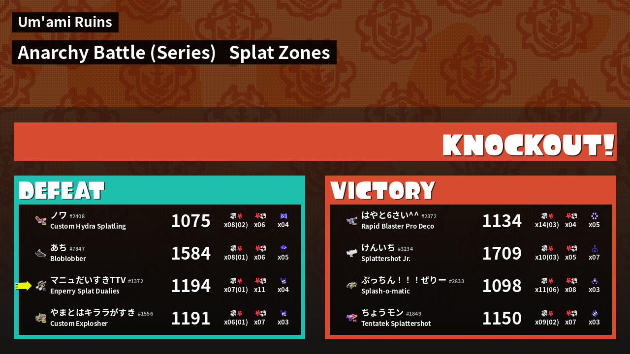 | Weapon | Enperry Splat Dualies ( Curling Bomb / Triple Splashdown) | ||