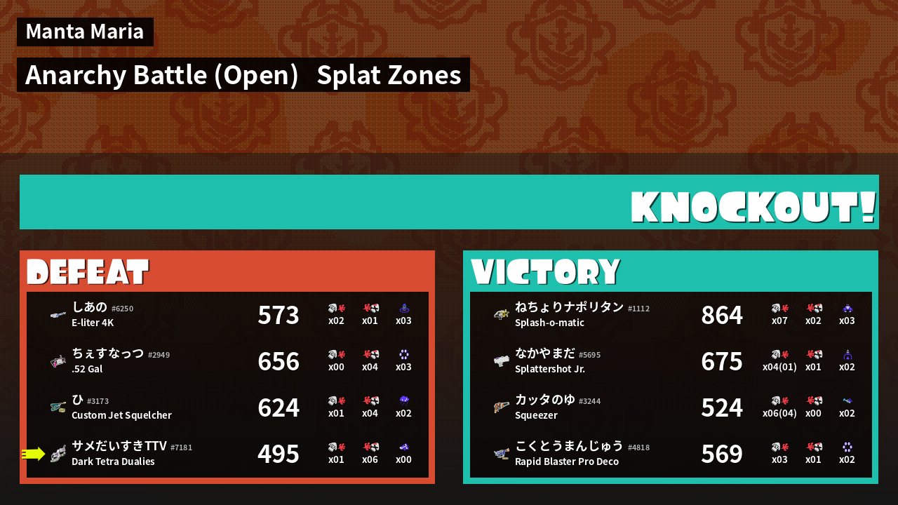 | Mode | Splat Zones - Anarchy Battle (Open) | ||