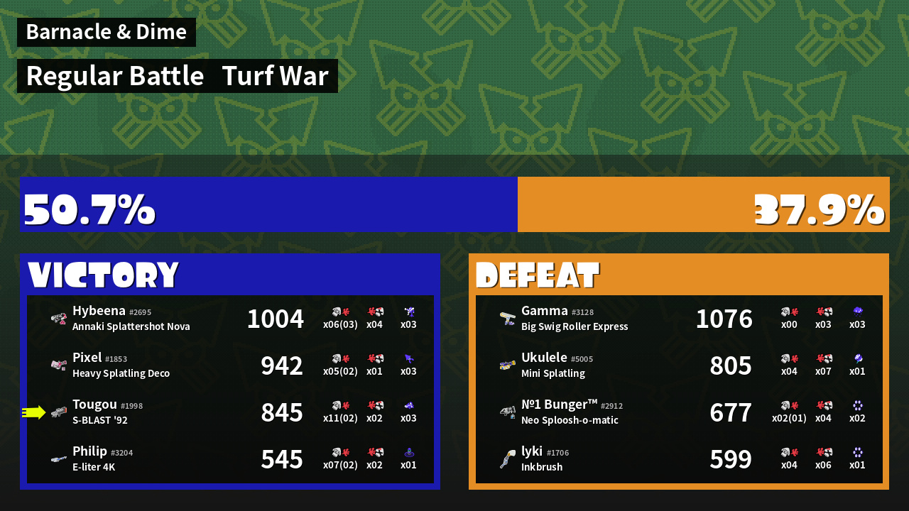 | Medals | #1 Overall Splatter #1 Popular Target #1 Enemy-Base Inker |