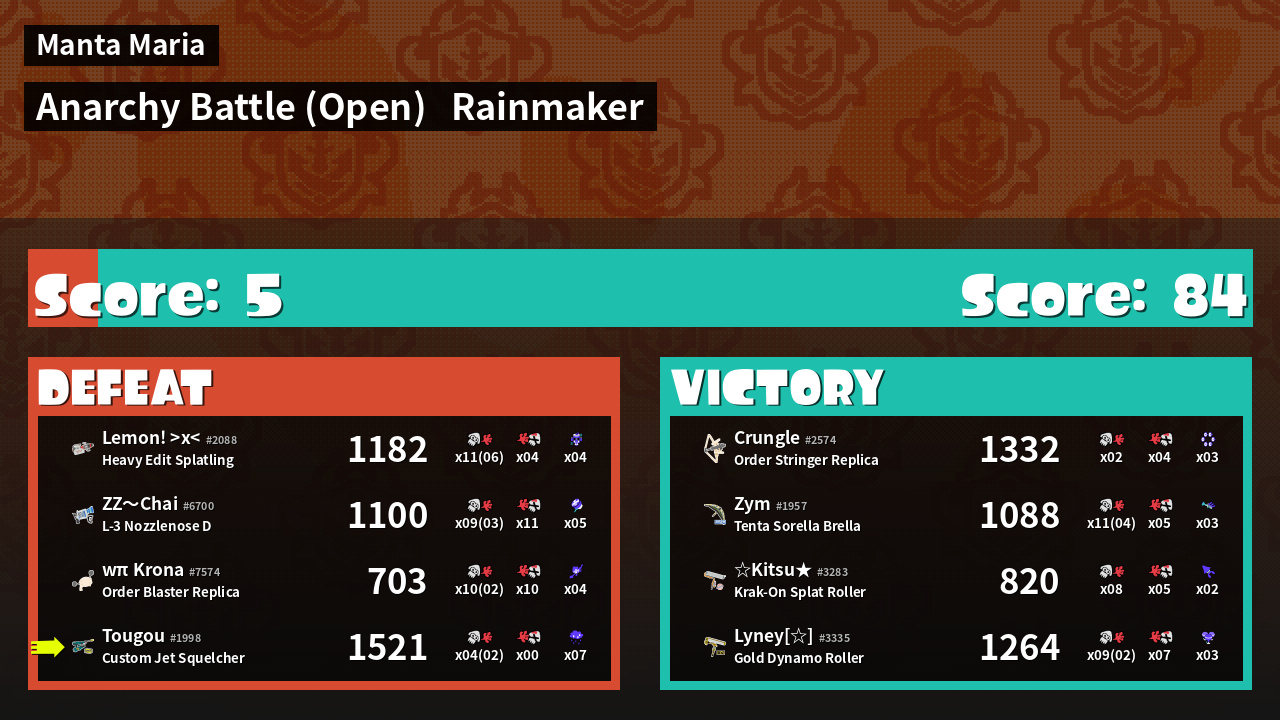 | Mode | Rainmaker - Anarchy Battle (Open) | ||
