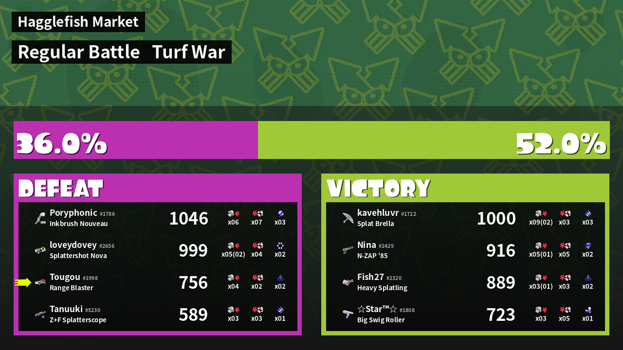 | Medals | #1 Super Jump Spot #1 Damage Taker #1 Ink Consumer |