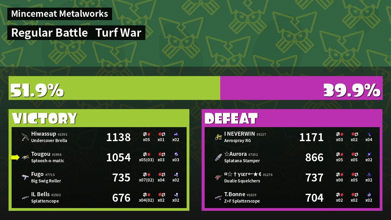 | Medals | #1 Enemy-Base Inker #1 Splat Assister #1 Base Defender | ||