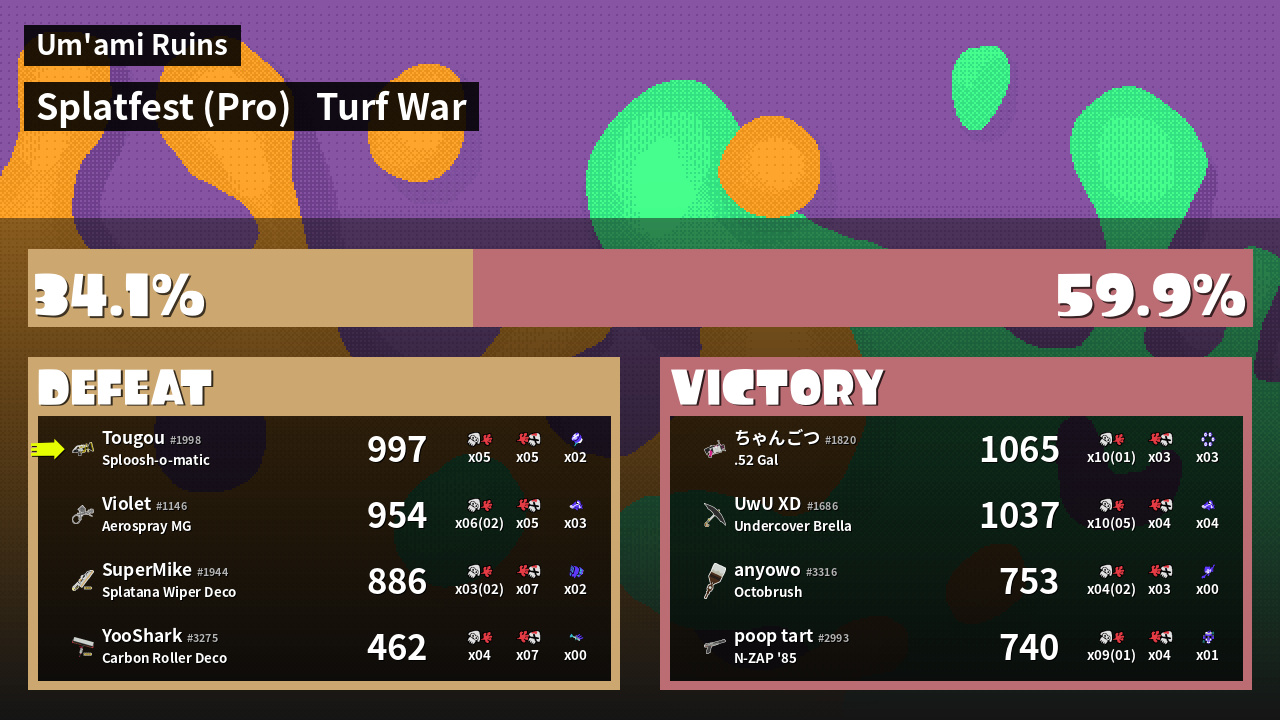| Medals | #1 Turf Inker #1 Super Jump Spot #1 Enemy Splatter | ||