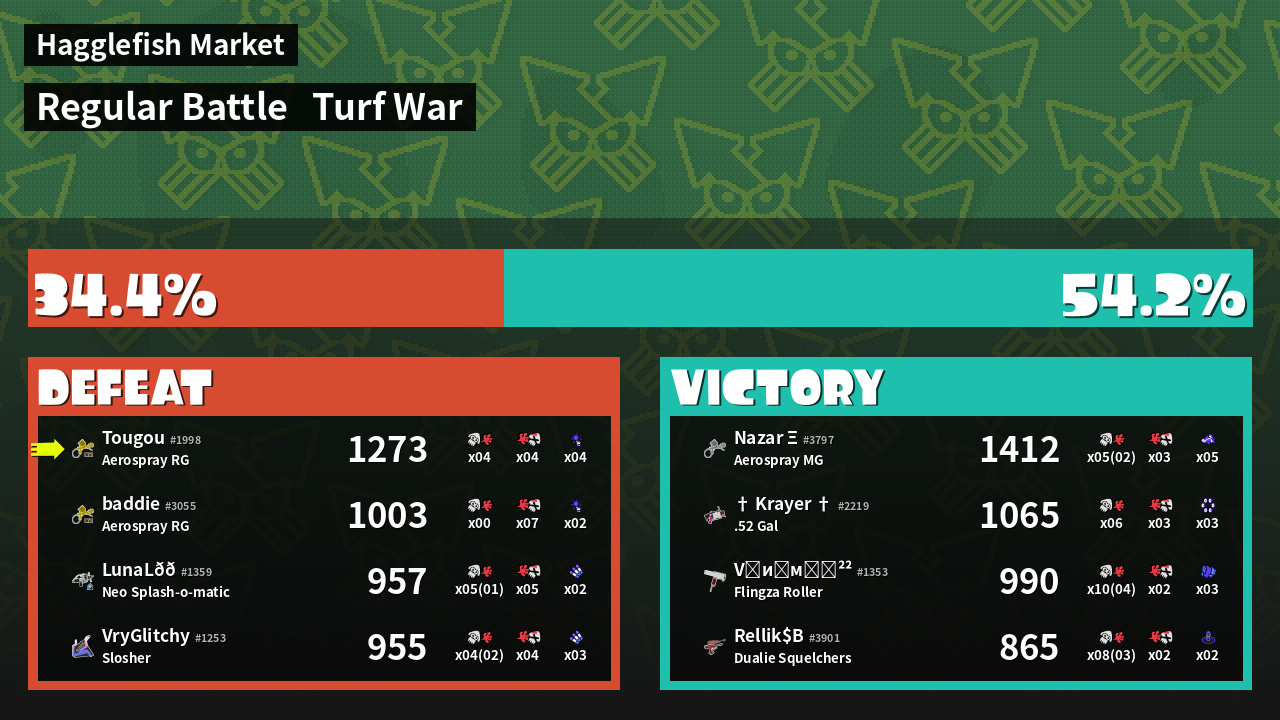 | Medals | #1 Turf Inker #1 Enemy Splatter #1 Ground Traveler | ||