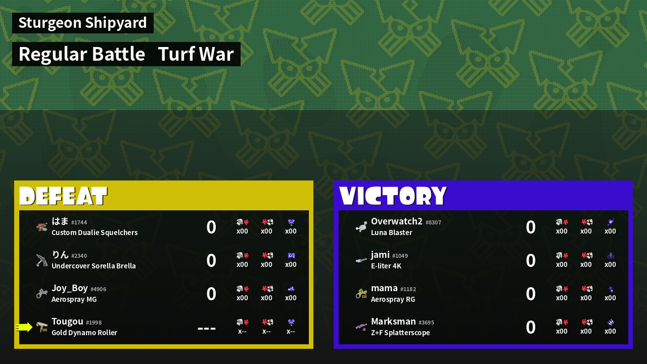 | Weapon | Gold Dynamo Roller ( Splat Bomb / Super Chump) | ||