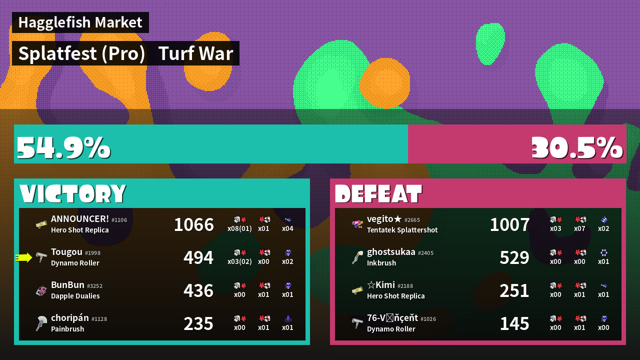 | Mode | Turf War - Splatfest (Pro) | ||