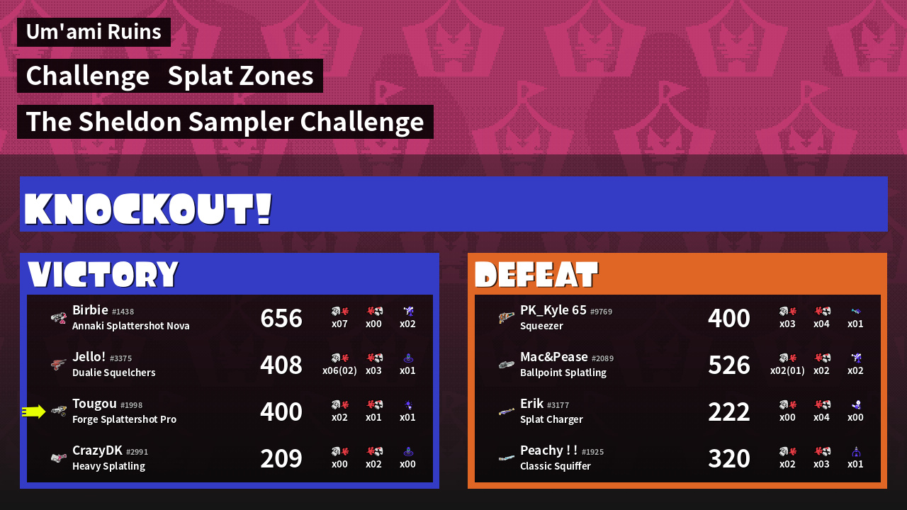 | Medals | #1 Damage Taker #1 Booyah Bomb User #2 Splat Zone Inker | ||