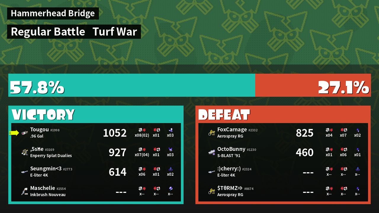 | Medals | #1 Overall Splatter #1 Turf Inker #1 Enemy-Base Inker | ||