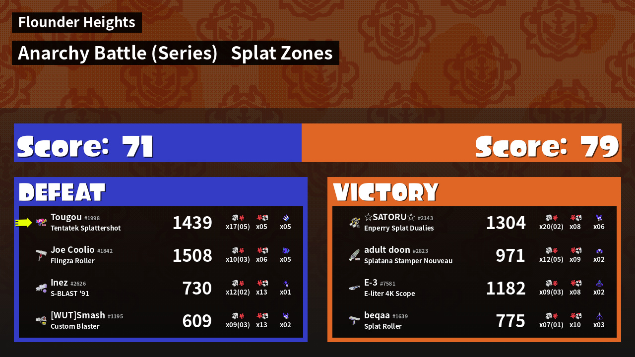 | Medals | #1 Overall Splatter #1 Splat Zone Guard #1 Enemy Splatter | ||