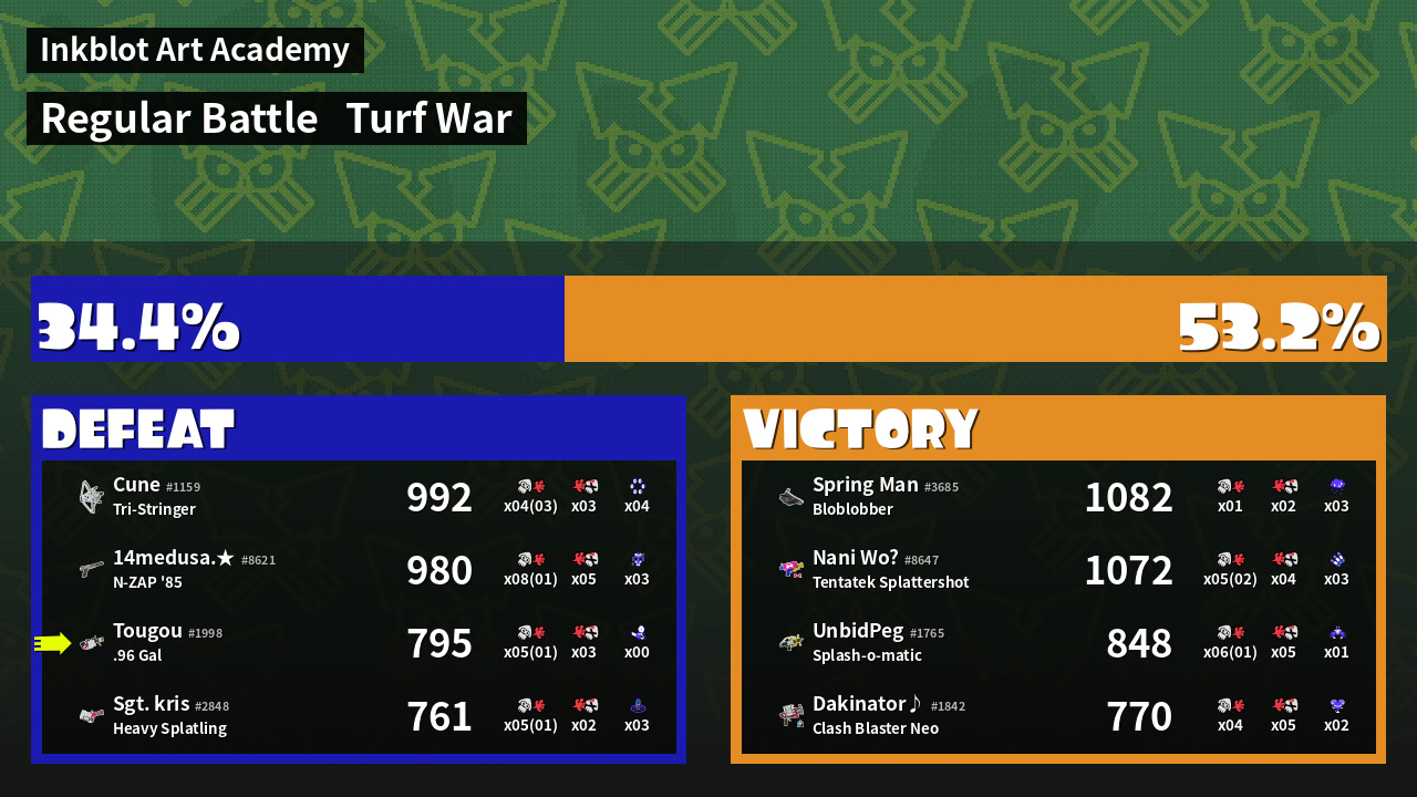 | Medals | #1 Ink Consumer #2 Overall Splatter #2 Popular Target | ||