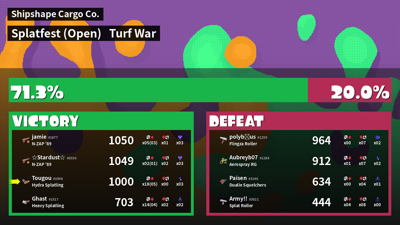 | Medals | #1 Overall Splatter #1 Popular Target #1 Enemy-Base Inker | ||