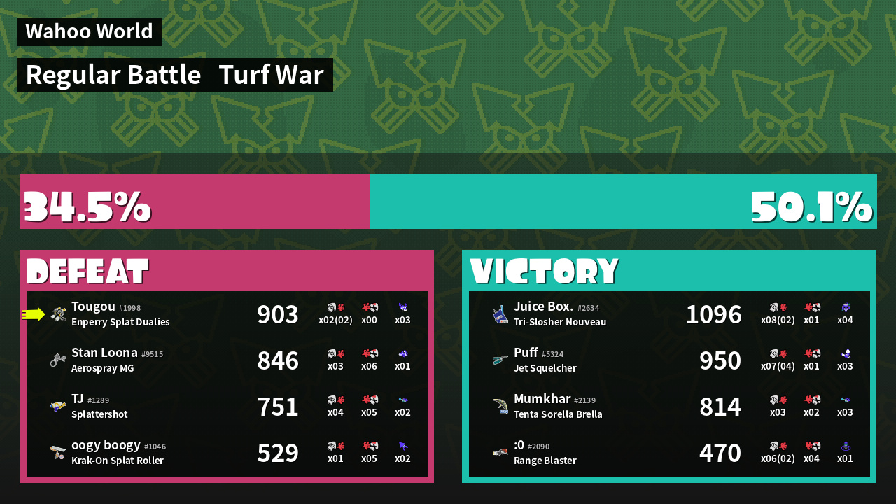 | Weapon | Enperry Splat Dualies ( Curling Bomb / Triple Splashdown) | ||