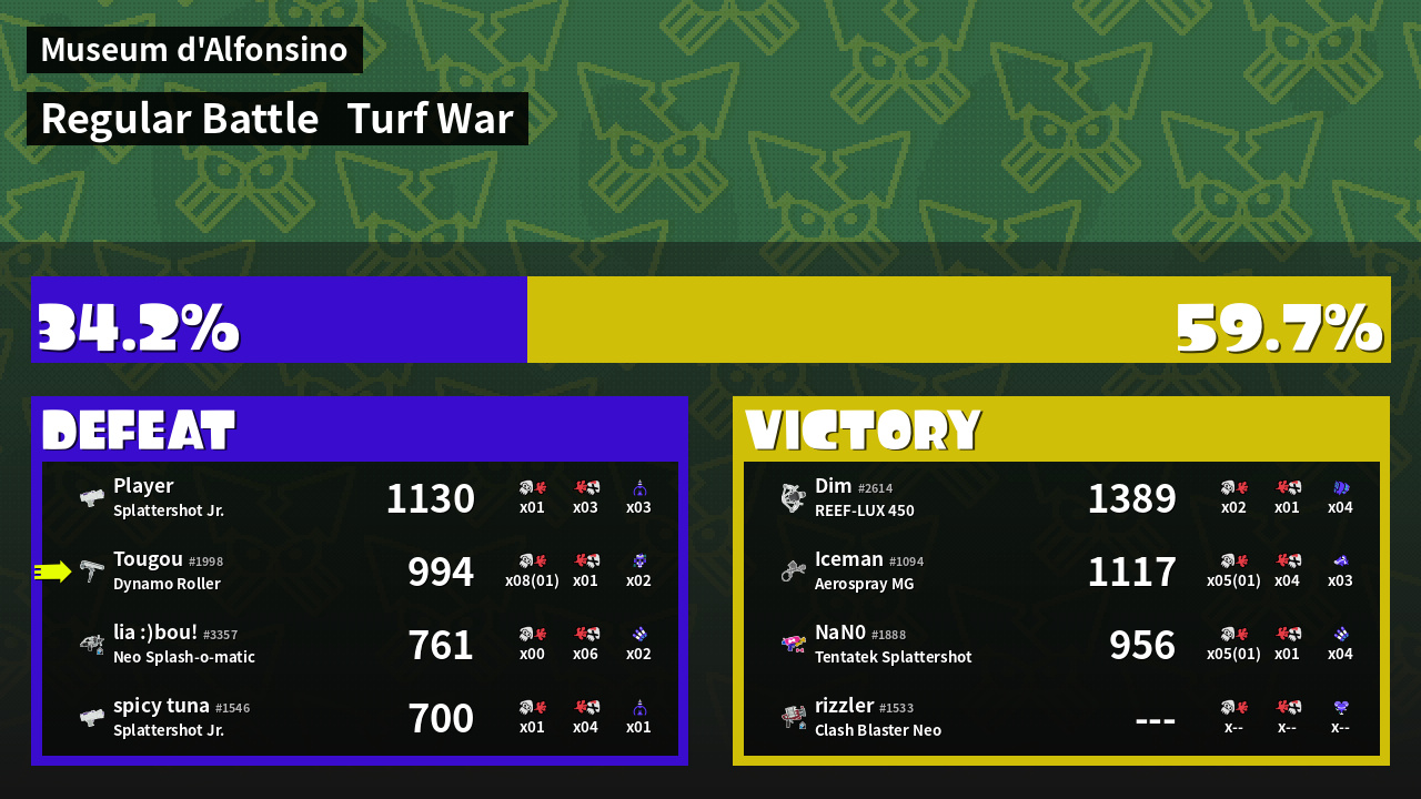 | Medals | #1 Overall Splatter #1 Popular Target #1 Enemy-Base Inker | ||