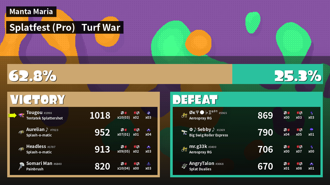 | Medals | #1 Overall Splatter #1 Turf Inker #1 Enemy Splatter | ||