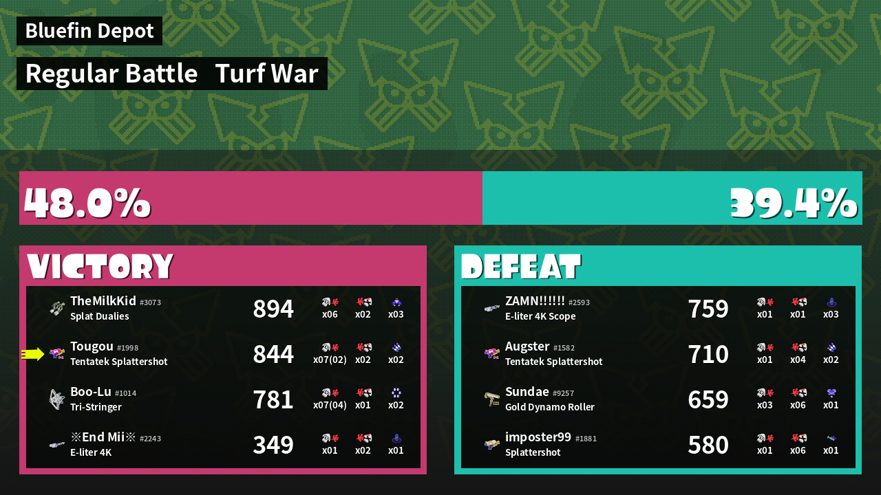 | Medals | #1 Overall Splatter #1 Enemy-Base Inker #1 Ink Consumer | ||