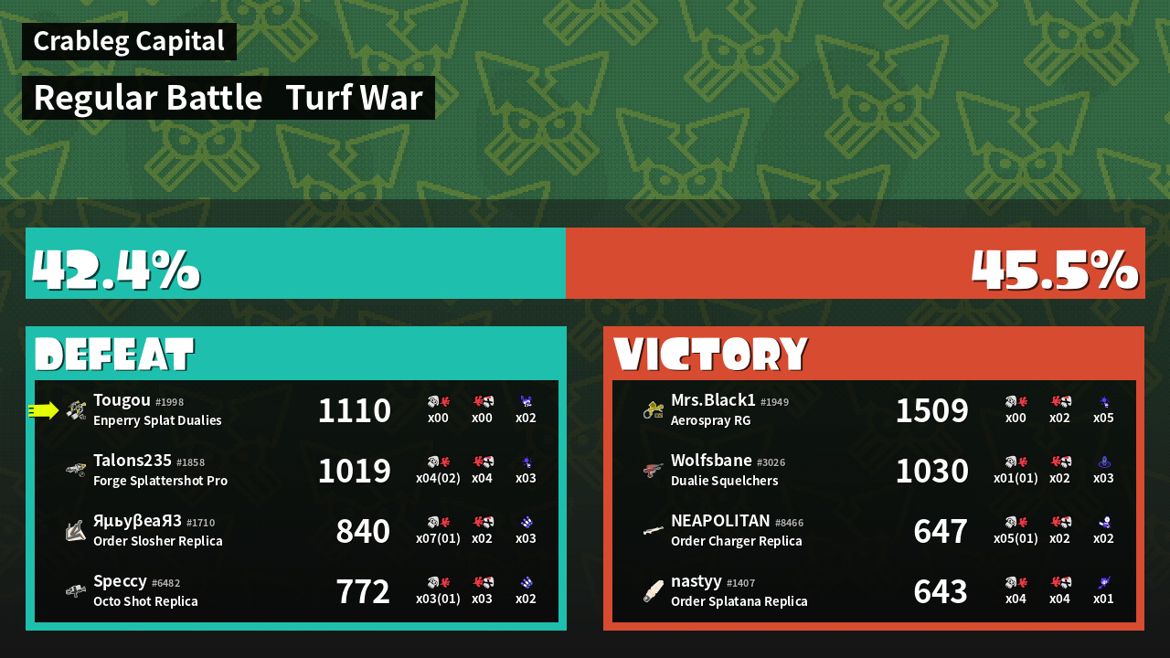 | Weapon | Enperry Splat Dualies ( Curling Bomb / Triple Splashdown) | ||