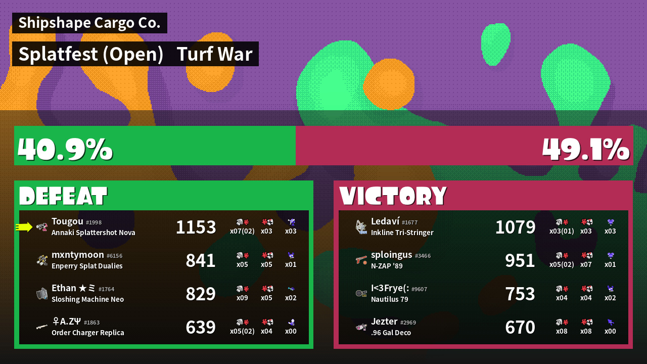 | Medals | #1 Turf Inker #1 Enemy-Base Inker #1 Splat Assister | ||