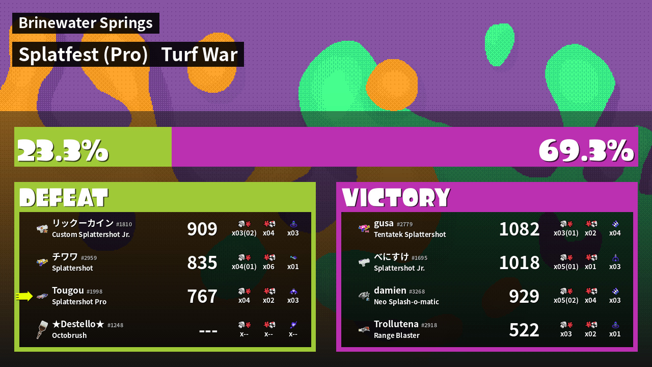 | Weapon | Splattershot Pro ( Angle Shooter / Crab Tank) | ||