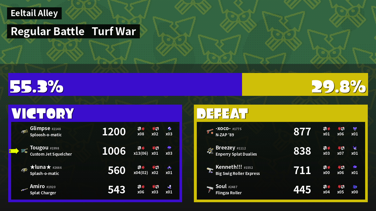 | Medals | #1 Overall Splatter #1 Popular Target #1 Enemy-Base Inker | ||
