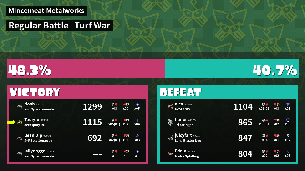 | Medals | #1 Overall Splatter #1 Enemy-Base Inker #1 Enemy Splatter | ||