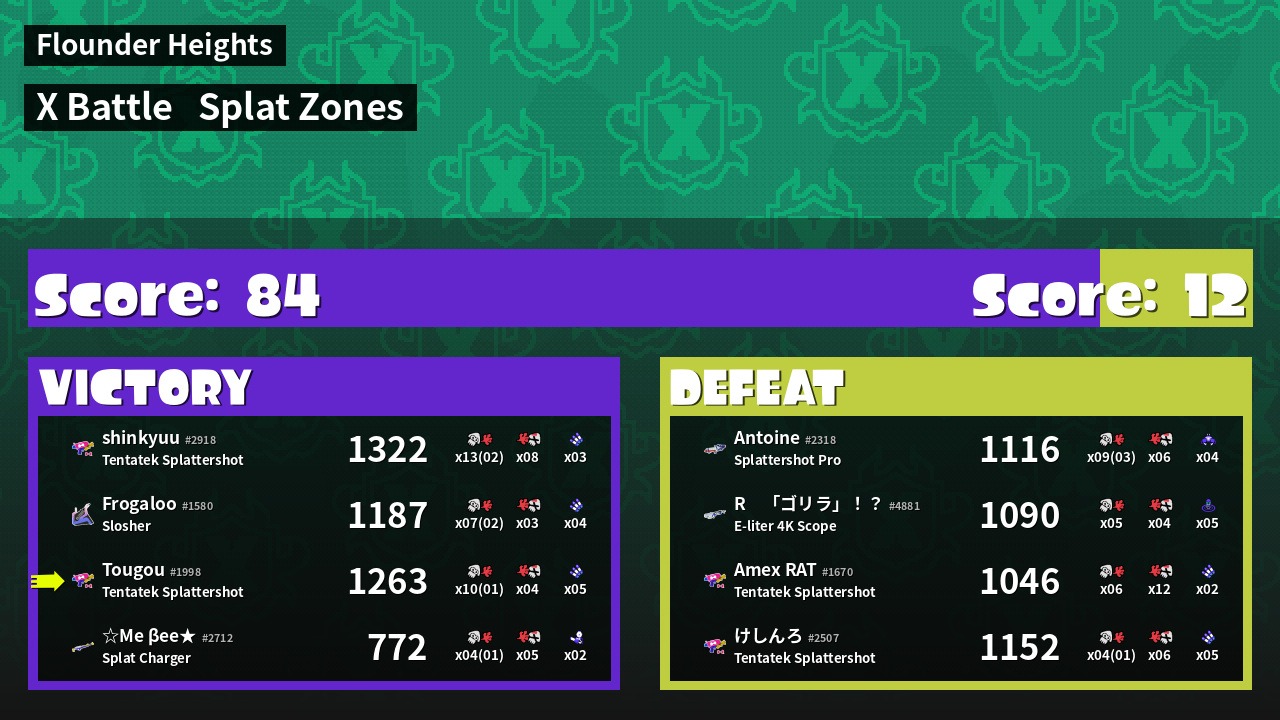| Medals | #1 Splat Zone Guard #1 Triple Inkstrike User #2 Overall Splatter | ||