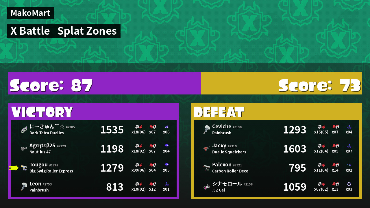 | Medals | #1 Splat Assister #2 Splat Zone Guard #2 Turf Inker | ||