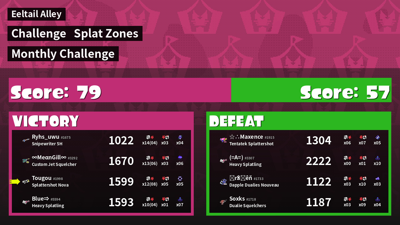 | Medals | #1 Splat Zone Guard #1 Splat Assister #1 Splat Zone Hero | ||