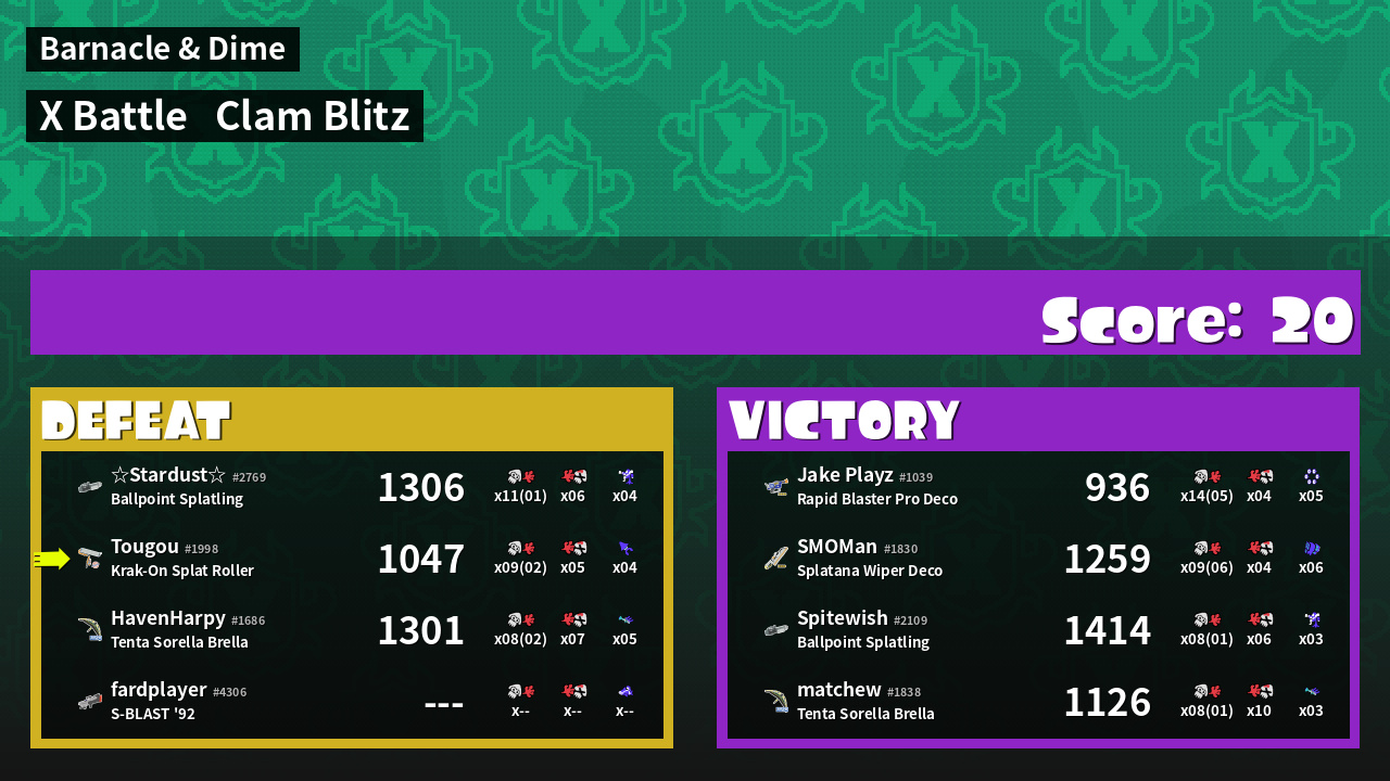 | Medals | #1 Super Jump Spot #1 Splat Assister #1 Clam Stopper | ||