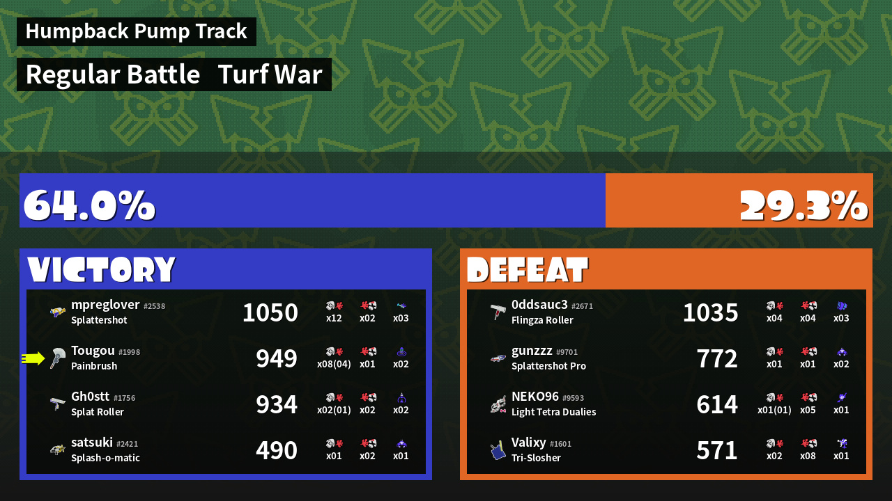 | Medals | #1 Enemy-Base Inker #1 Splat Assister #1 Ground Traveler | ||