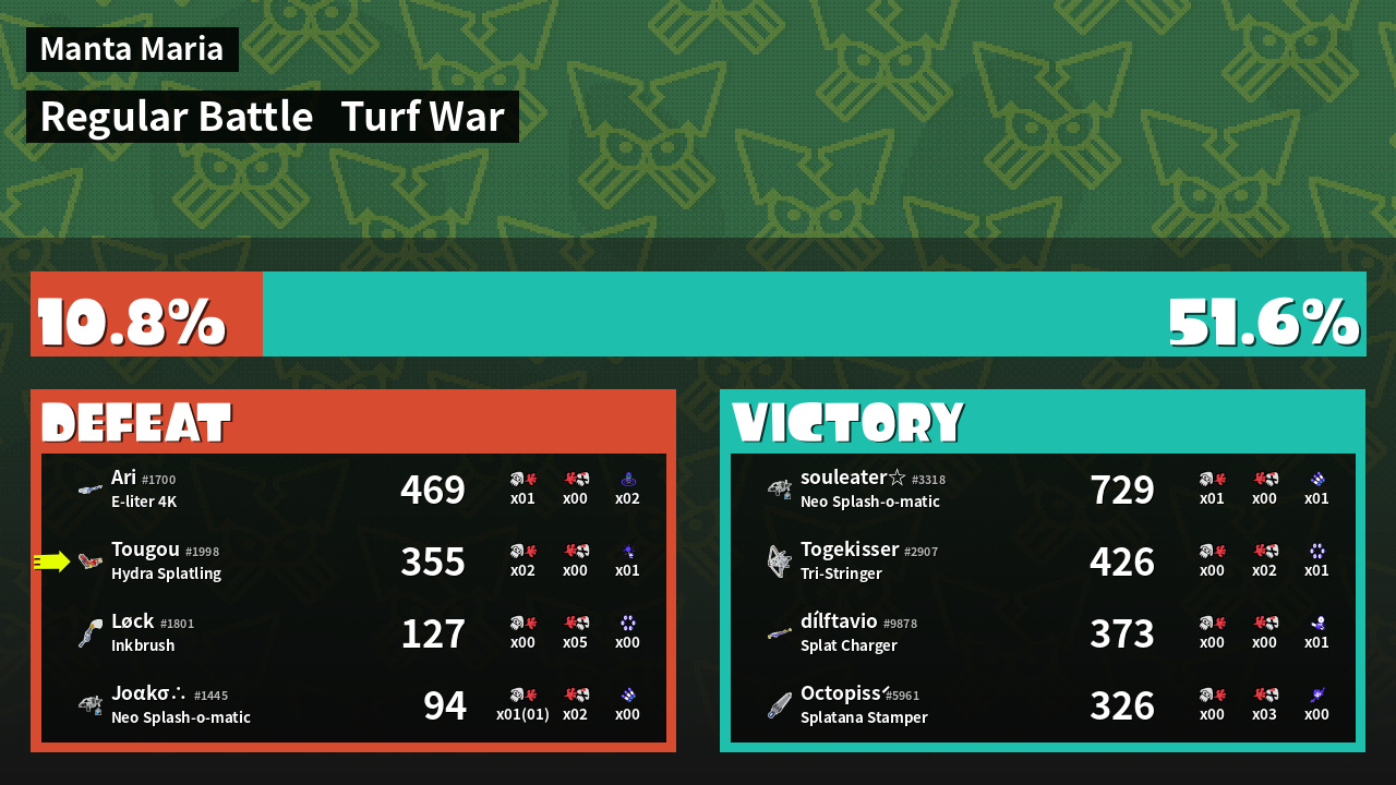 | Medals | #1 Overall Splatter #1 Popular Target #1 Enemy-Base Inker | ||