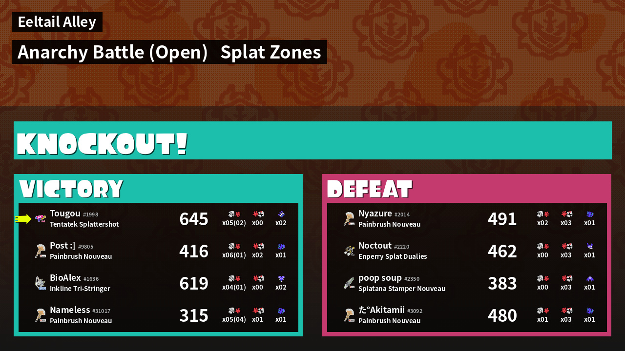 | Medals | #1 Splat Zone Guard #1 Turf Inker #1 Popular Target | ||