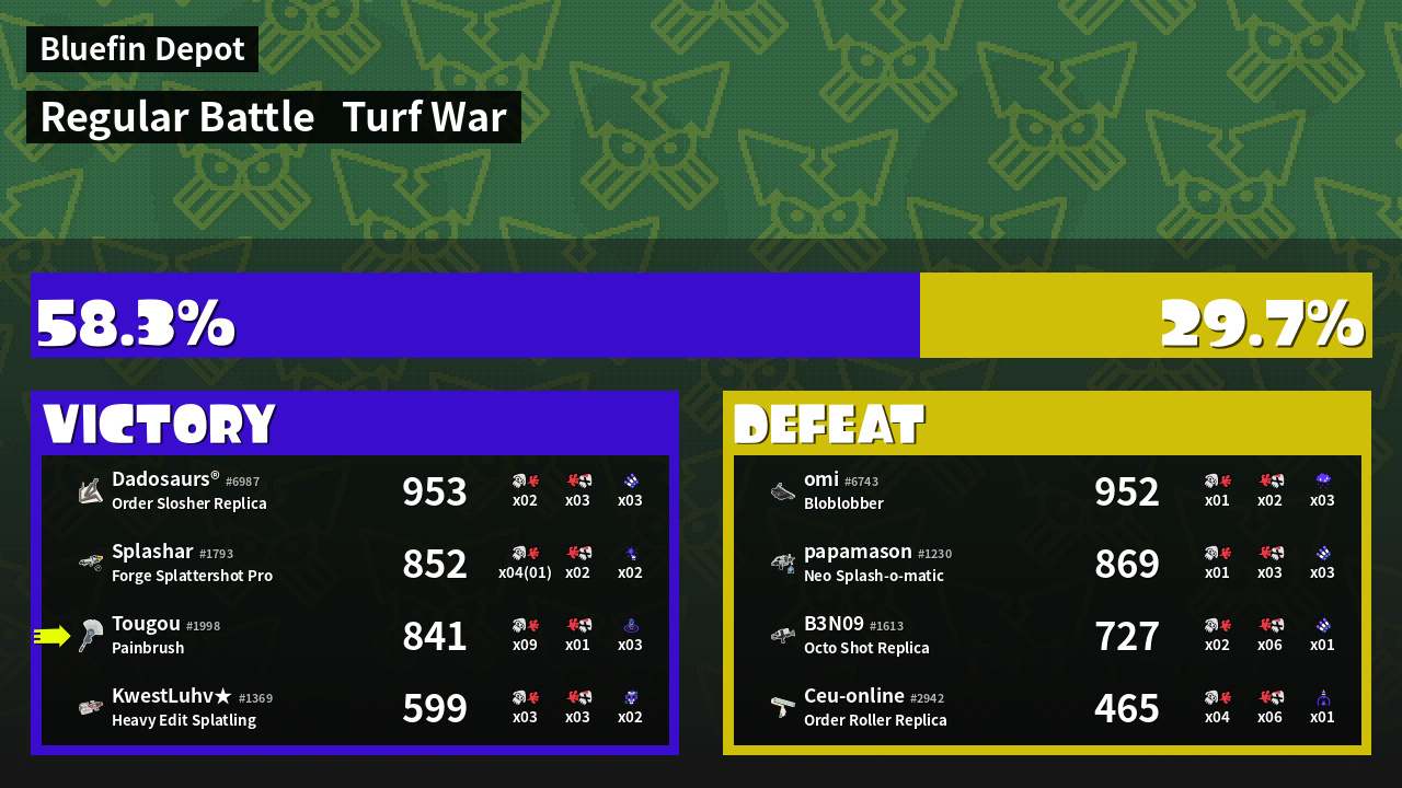 | Medals | #1 Overall Splatter #1 Popular Target #1 Enemy-Base Inker | ||