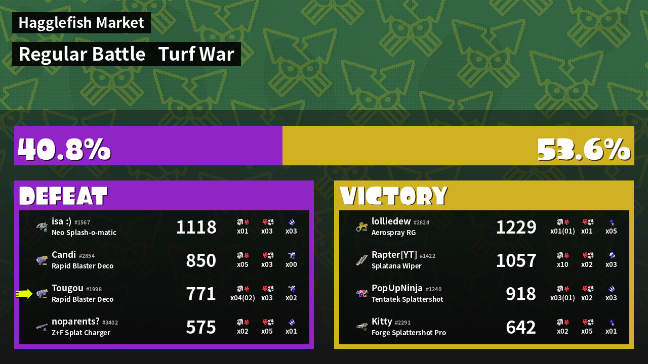 | Medals | #1 Enemy-Base Inker #1 Splat Assister #1 Base Defender |