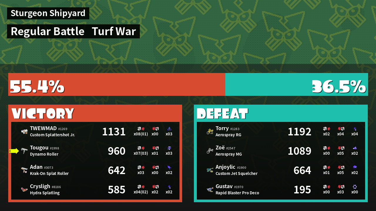 | Medals | #1 Popular Target #1 Enemy-Base Inker #1 Splat Assister | ||