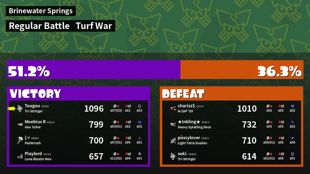 | Medals | #1 Turf Inker #1 Splat Assister #1 Killer Wail 5.1 User | ||
