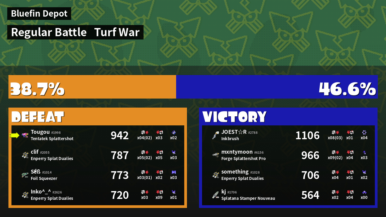 | Weapon | Tentatek Splattershot ( Splat Bomb / Triple Inkstrike) | ||