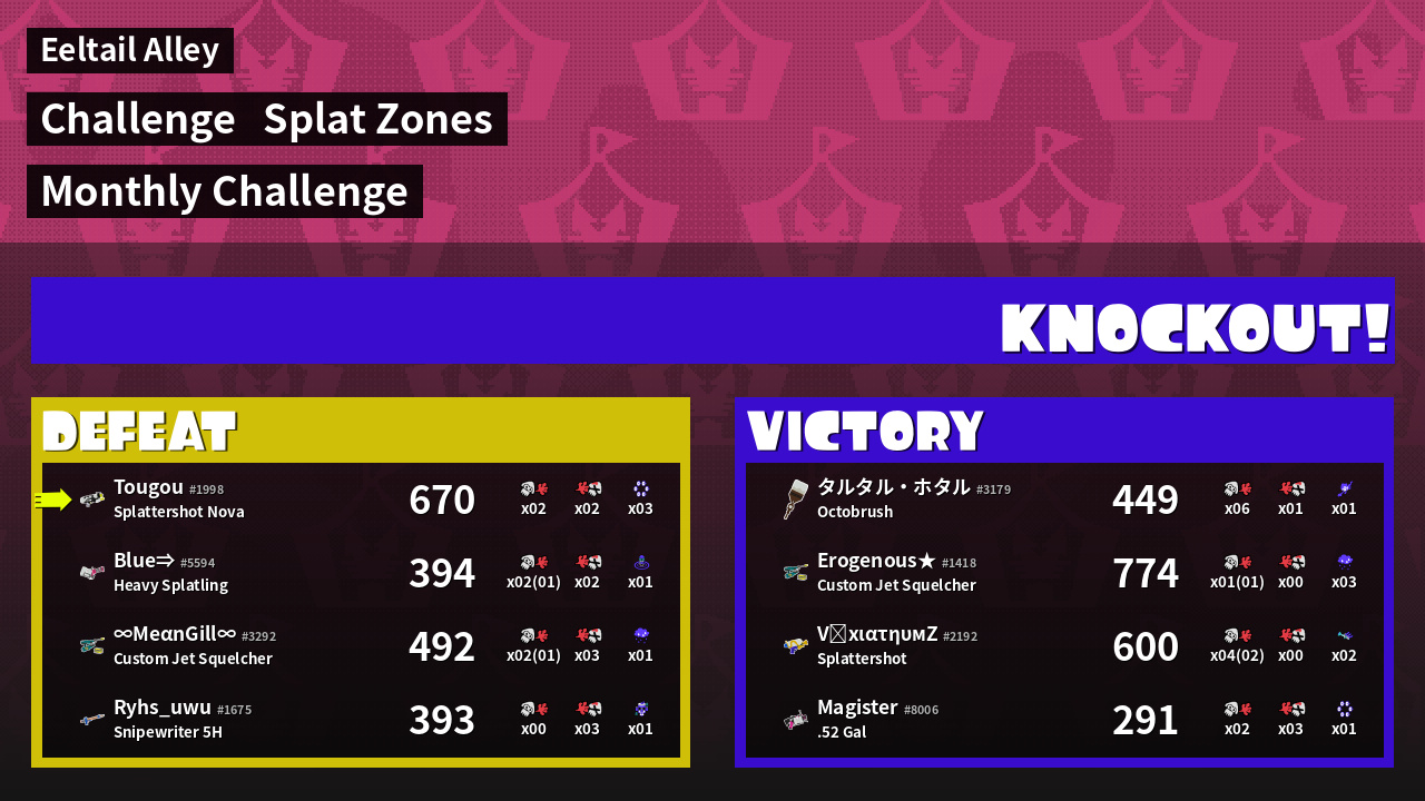 | Medals | #1 Overall Splatter #1 Splat Zone Guard #1 Turf Inker | ||