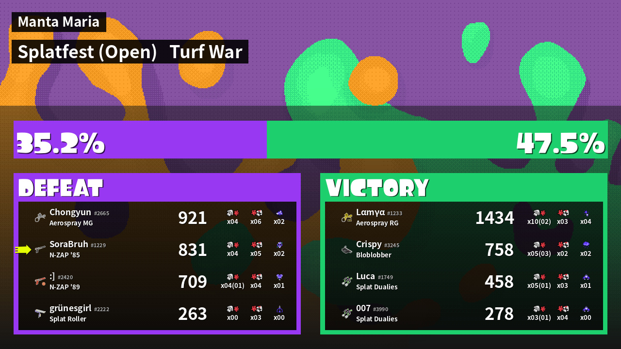 | Medals | #1 Overall Splatter #1 Enemy-Base Inker #1 Super Jump Spot | ||