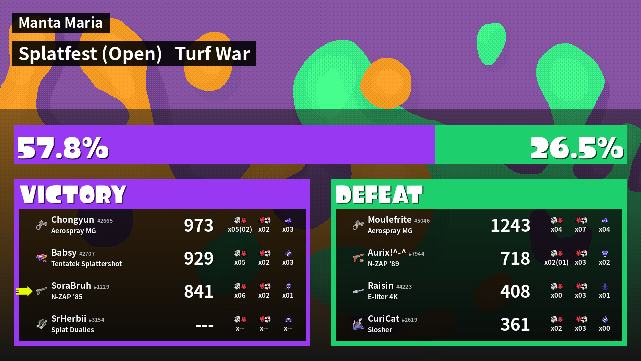 | Medals | #1 Overall Splatter #1 Enemy-Base Inker #1 Super Jump Spot | ||
