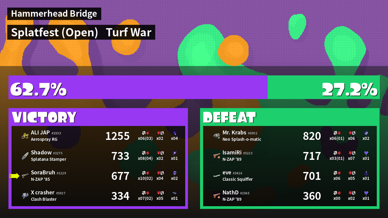 | Medals | #1 Overall Splatter #1 Enemy-Base Inker #1 Enemy Splatter | ||